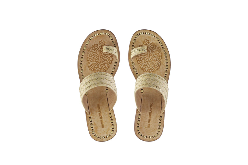 Sole & Upper sole : Wooden Sole covered in Leather, Stamped upper sole with gold leather details