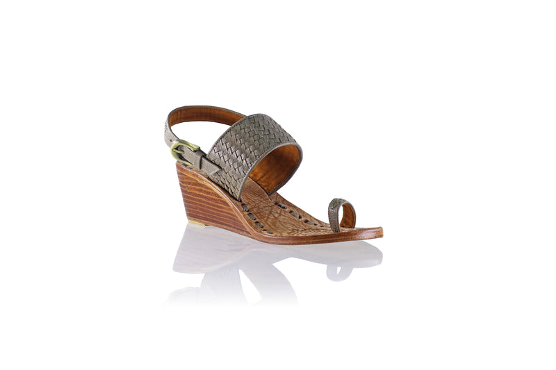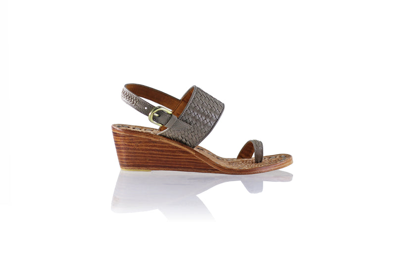 Prana is sandal with a middle size wedge with a round front. Super comfy and light on your feet. It has a strap to hold your feet secured along a toe loop.