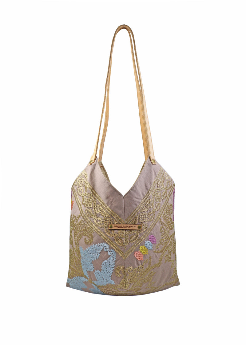 The metallic threads stand out against the background cloth to create a shimmering effect