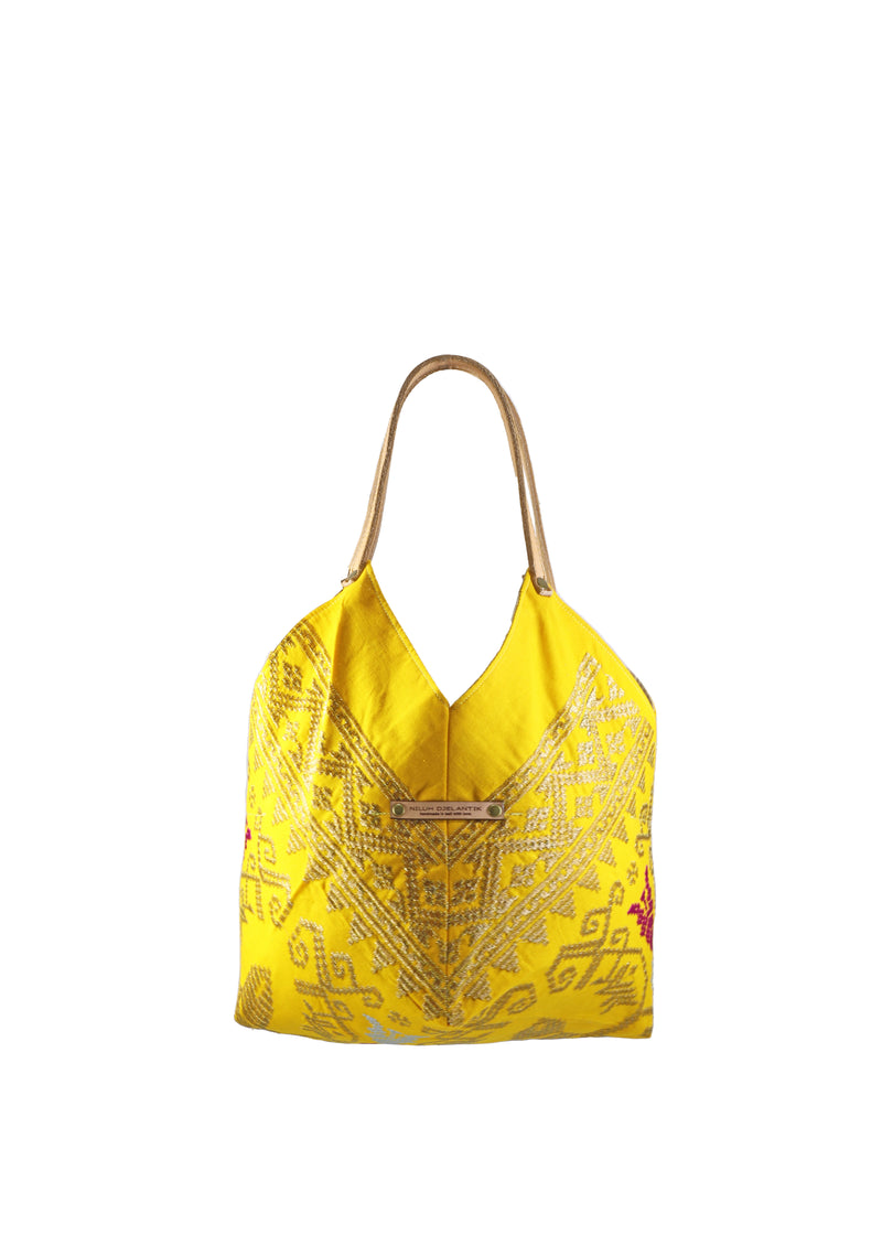 The metallic threads stand out against the background cloth to create a shimmering effect