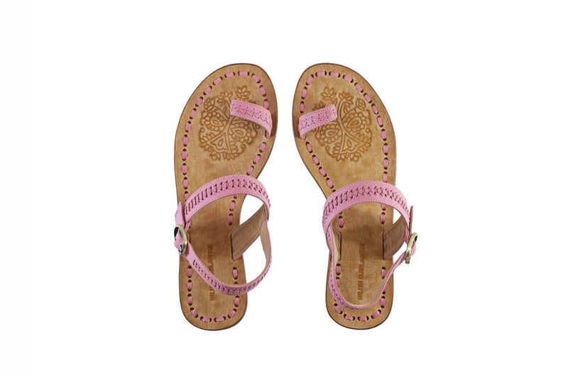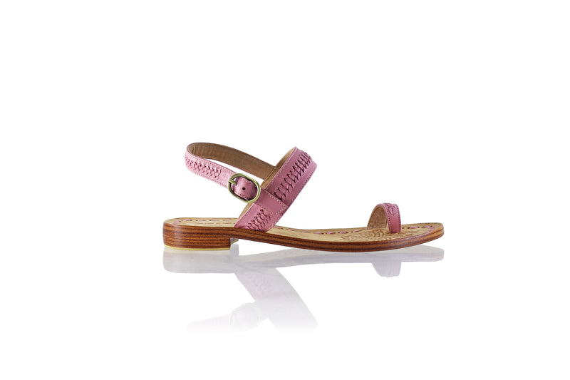 Sigi is Flat sandal with a round front. Super comfy and light on your feet. It has a strap to hold your feet secured along a toe loop. Your feet are hold by the bigger loop of detailed breaded Leather.